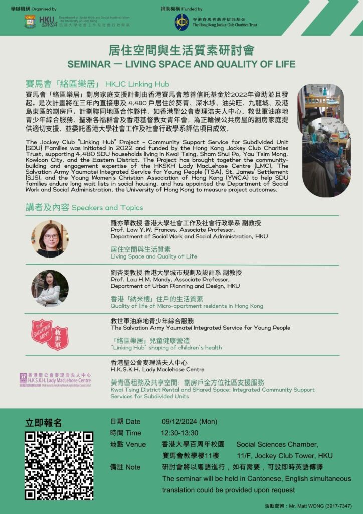 In December 2024, we hosted a seminar on living space and quality of life that brought together research and practice across Hong Kong’s most constrained housing contexts. Professor Law shared qualitative evidence and preliminary findings from a panel survey and evaluation study of families in subdivided units (SDUs), underscoring the distinct pain points of family life in cramped conditions—where routines, caregiving, privacy, and shared facilities demand more time, effort, and space than single-person living. Professor Lau presented on the Quality of Life of micro-apartment residents, including homeowners in new developments, revealing how limited space, utilities, and environmental deficiencies challenge wellbeing beyond middle-to-low income groups and pointing to areas for stronger design standards, regulation, and legislation. Two partnering NGOs—the Salvation Army Yaumatei Integrated Service for Young People and HKSKH Lady MacLehose Centre—showcased service models that strengthen SDU families through community support and physical health interventions. The HKU team continues to refine its logic model and theory of change to maximise impact.